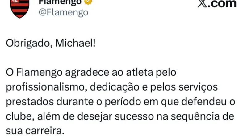 Michael não é mais jogador do Flamengo, o atacante, de 29 anos, rescindiu amigavelmente seu contrato com o clube, que tinha duração até fim de 2028. Além disso jogador já não vinha sendo utilizado pelo Filipe Luís há um tempo e encerrou sua passagem com 46 partidas, tendo seis gols e cinco assistências.